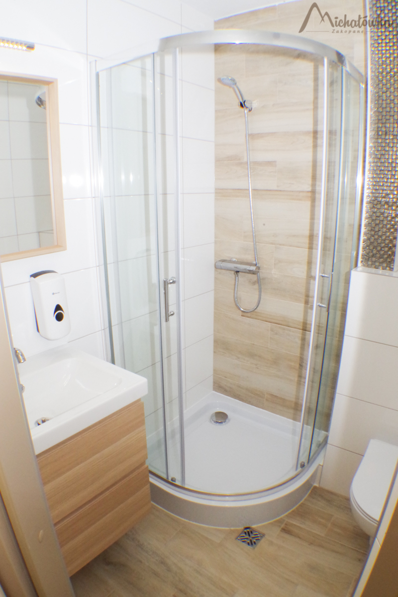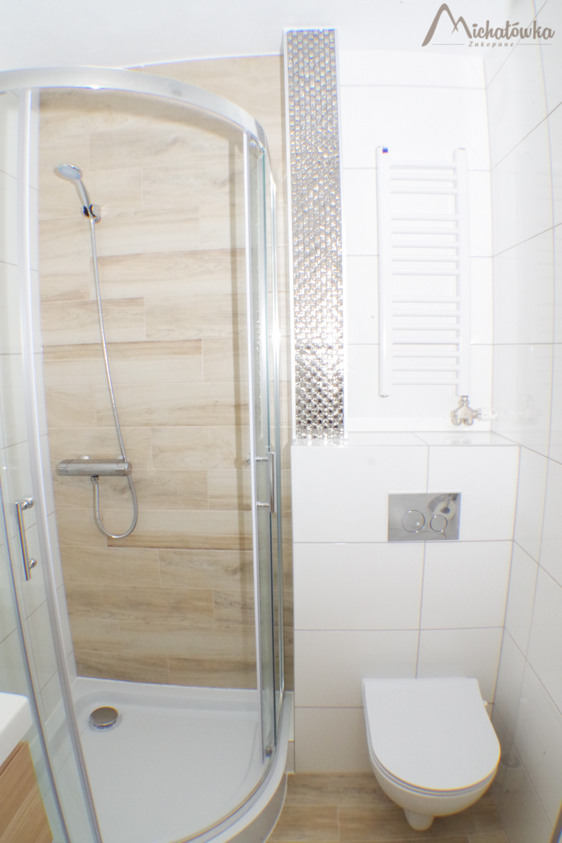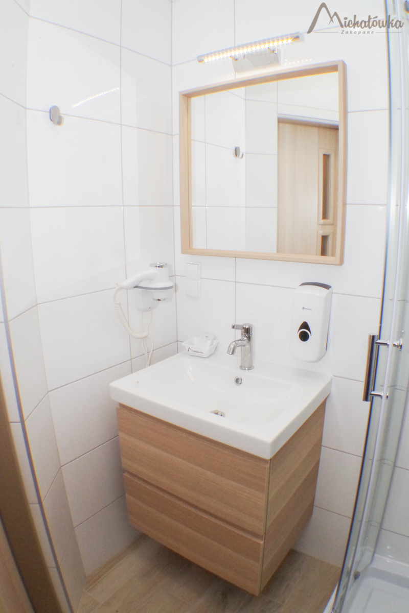 łazienkę z prysznicem oraz dodatkowym wyposażeniem typu suszarka do włosów, czy dozownik mydła w pianie