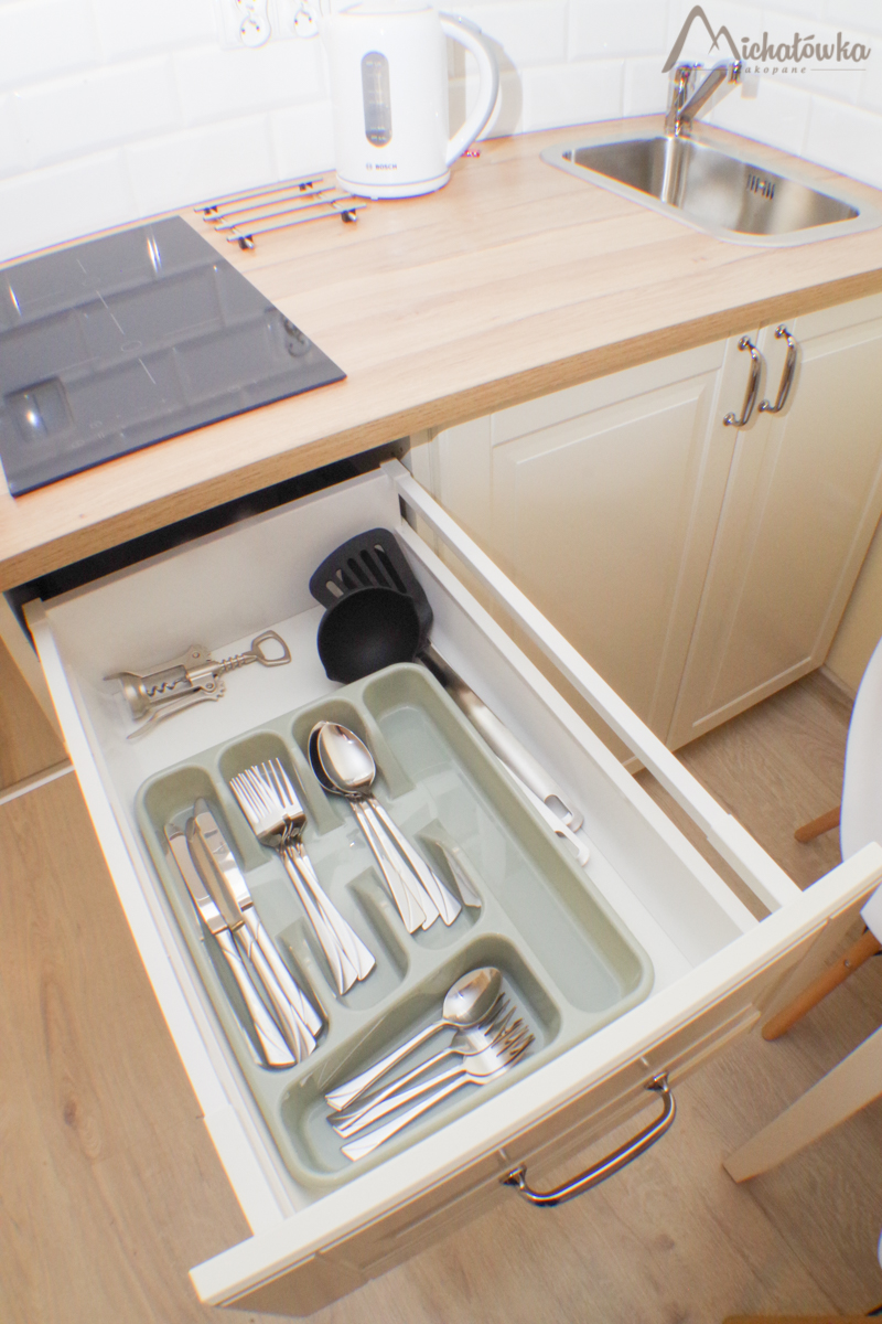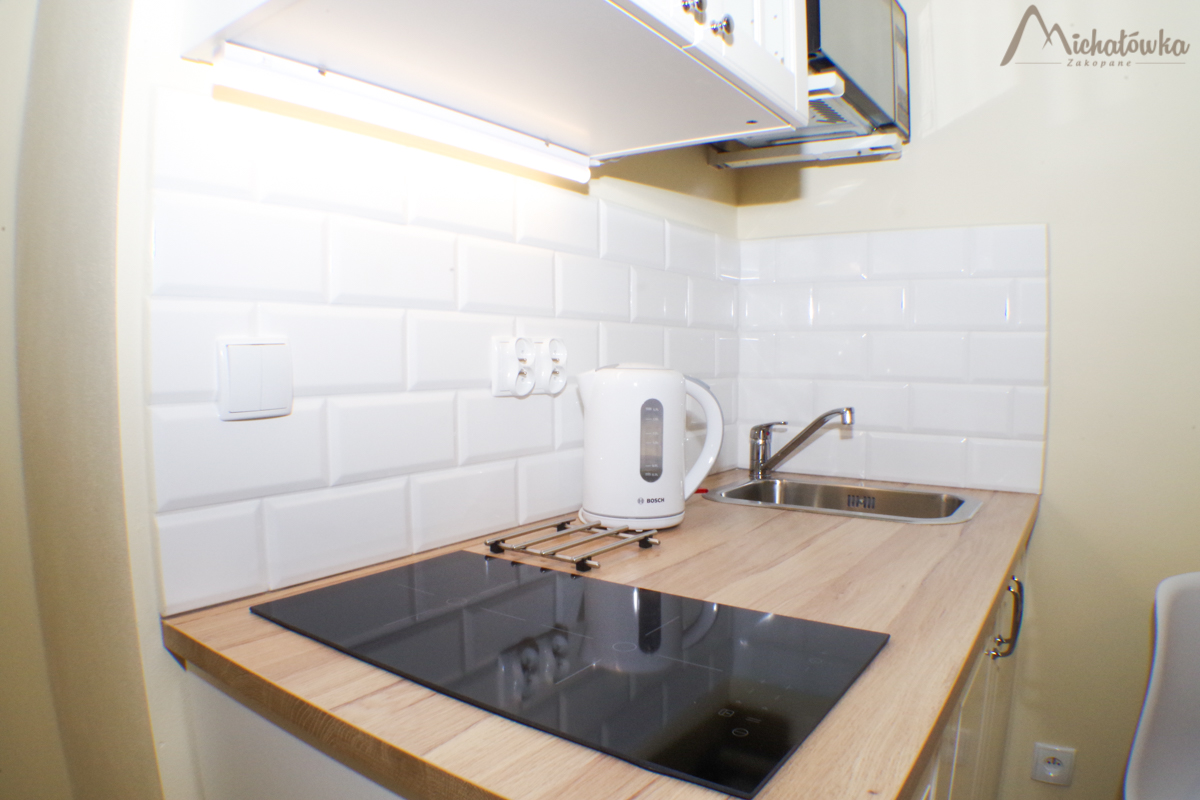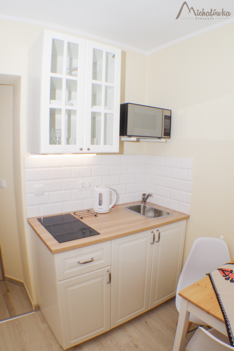 aneks kuchenny: zlewozmywak, lodówka, dwupalnikowa płyta indukcyjna, czajnik, kuchenka mikrofalowa z grillem, garnki, patelnia, sztućce, talerze, szklanki itp.