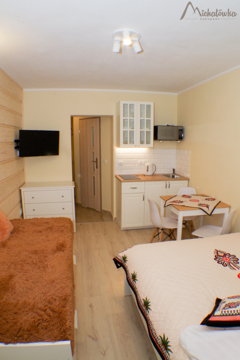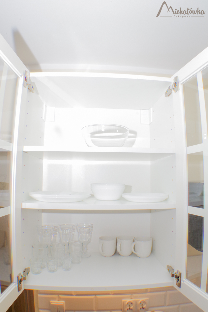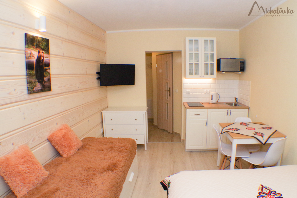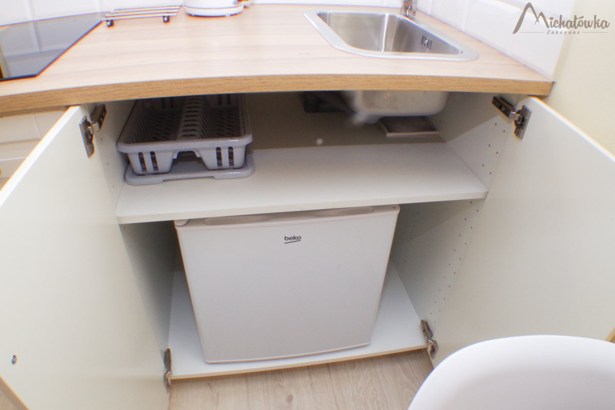 aneks kuchenny: zlewozmywak, lodówka, dwupalnikowa płyta indukcyjna, czajnik, kuchenka mikrofalowa z grillem, garnki, patelnia, sztućce, talerze, szklanki itp.