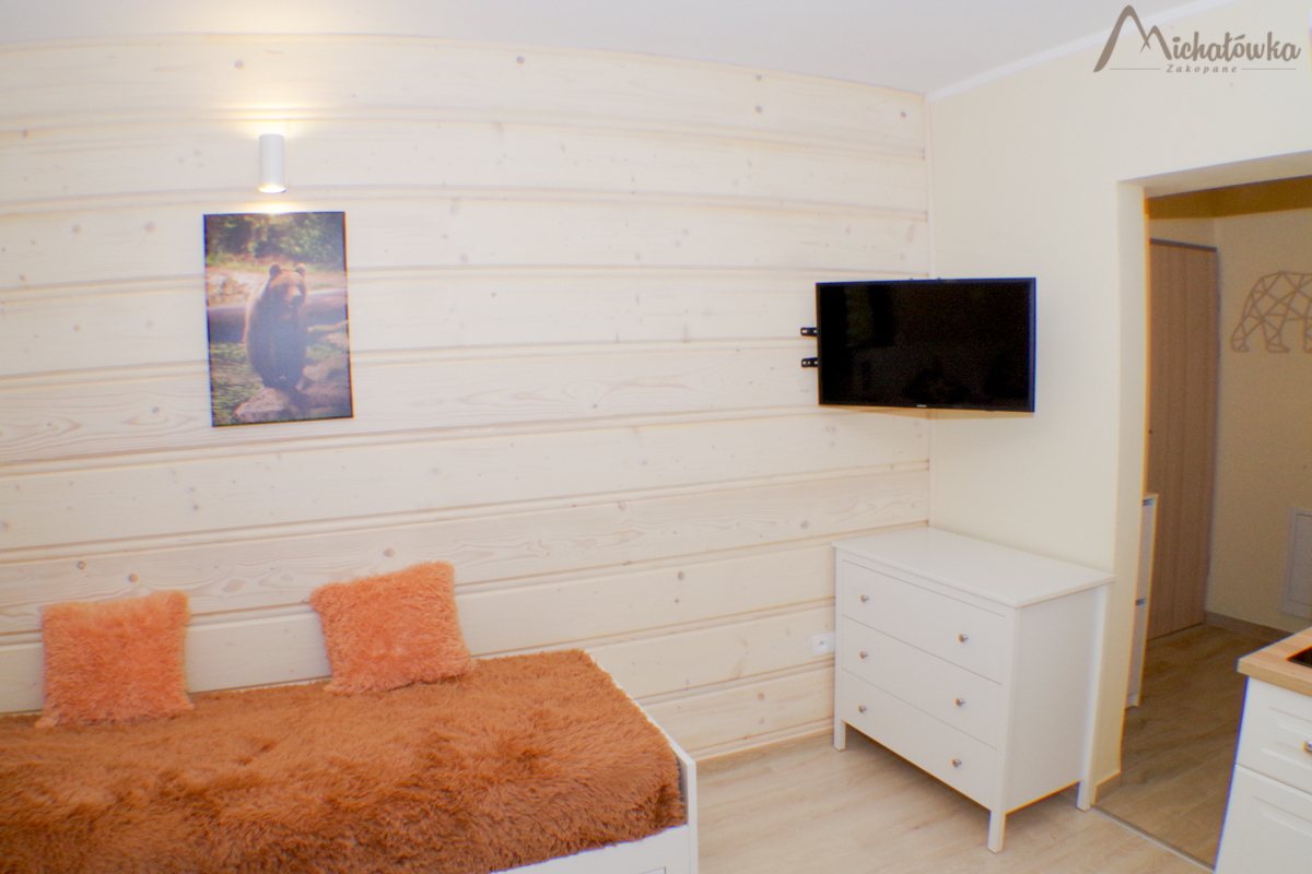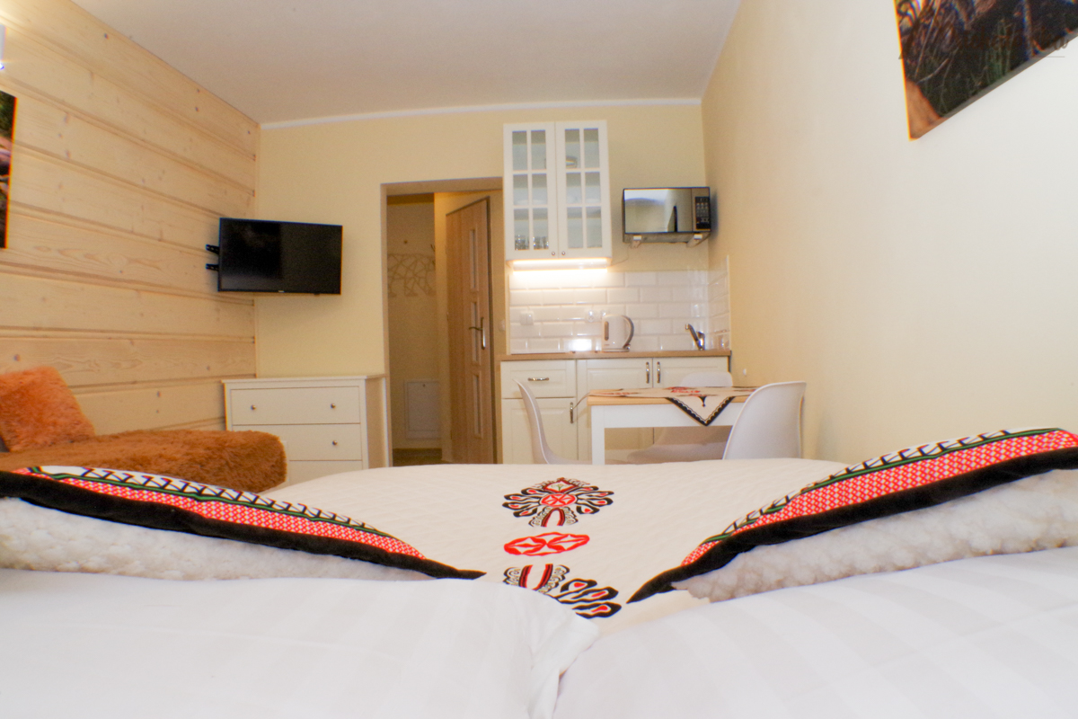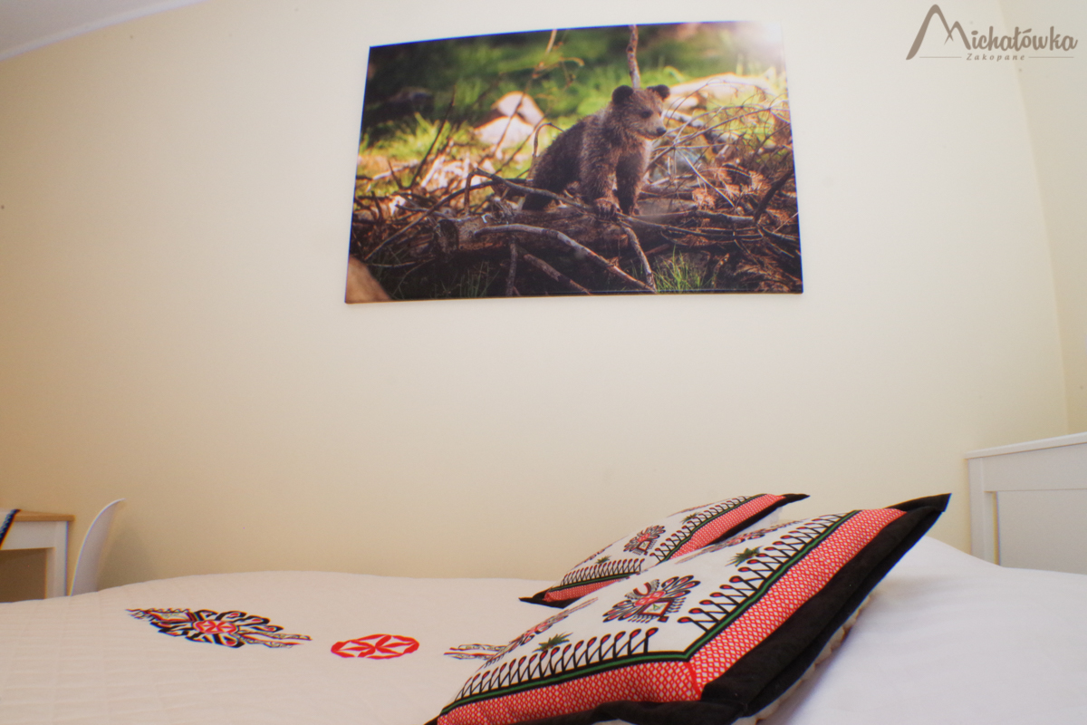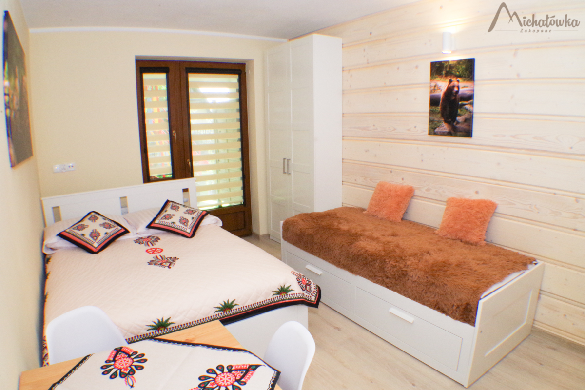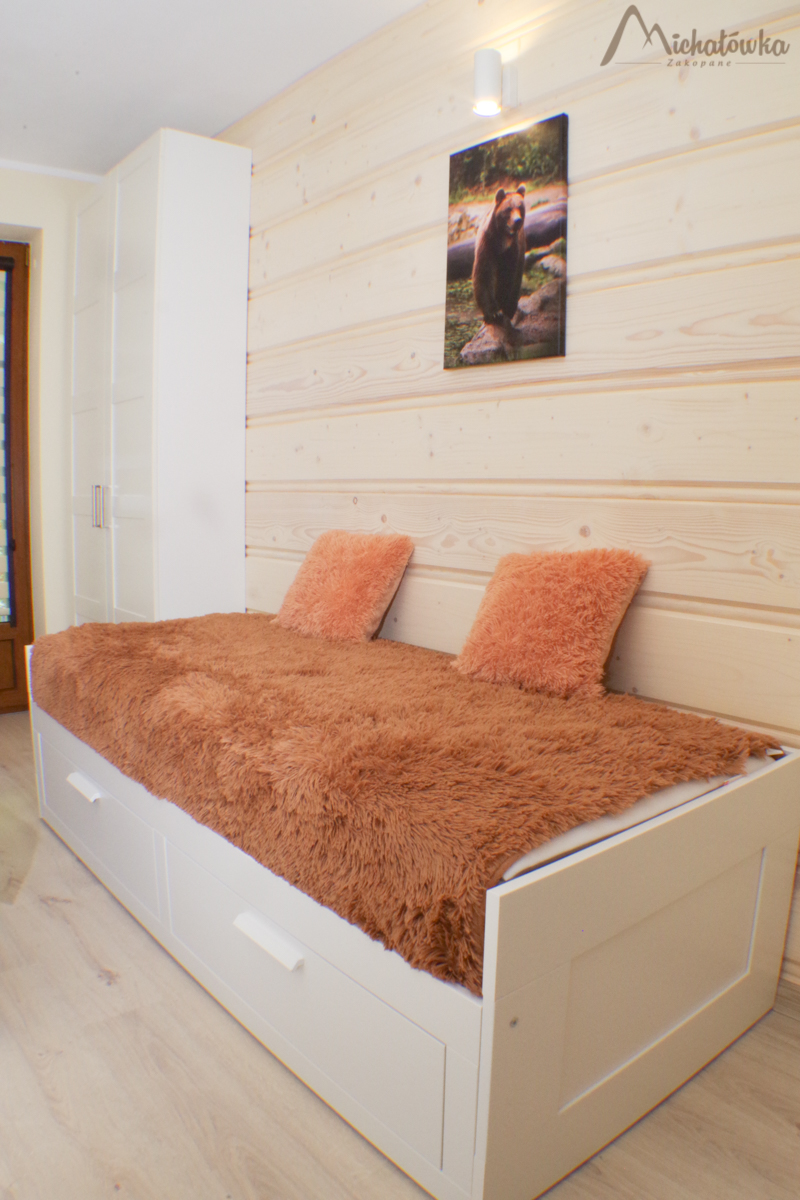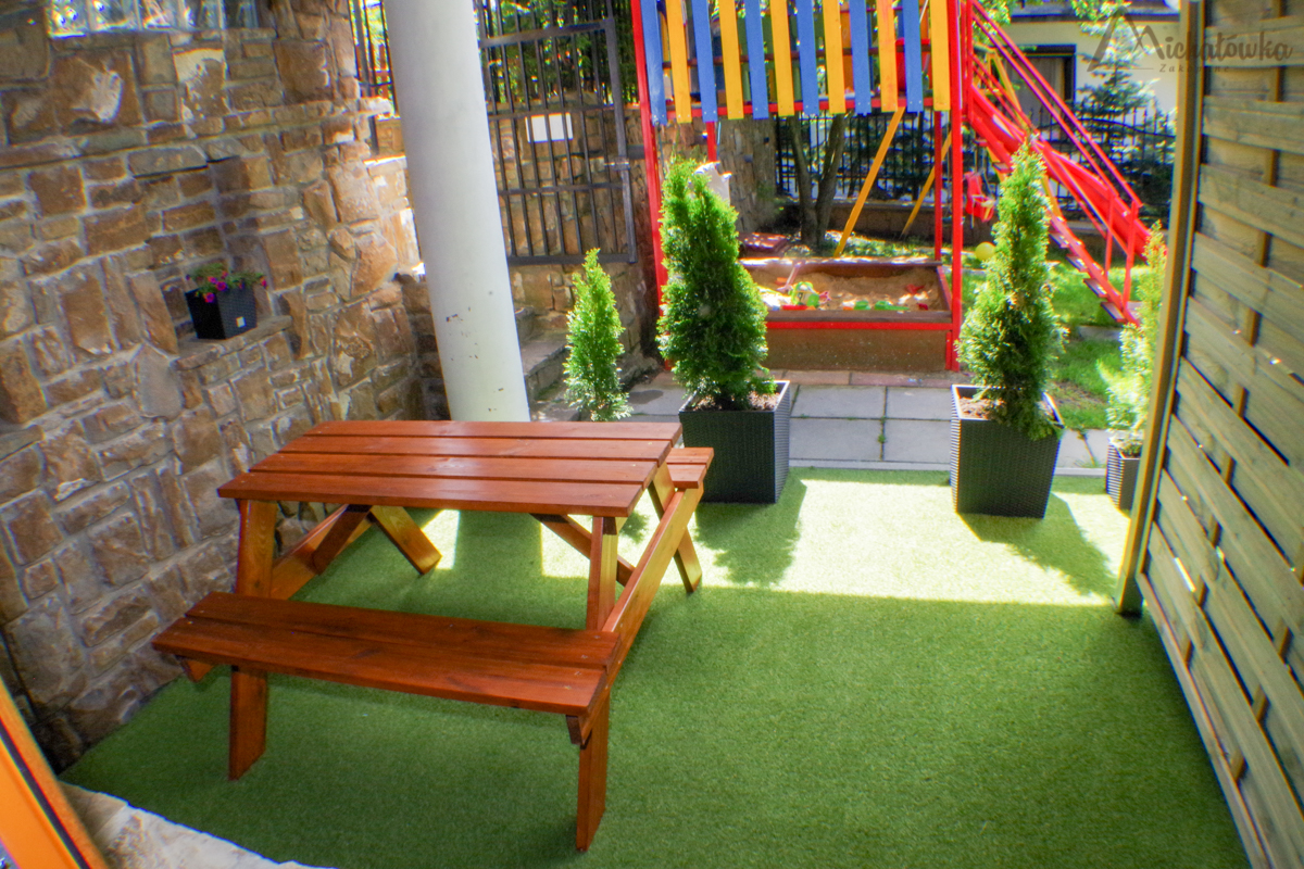 Ten pokój polecamy głównie rodzinom z dziećmi – bezpośrednie wyjście do ogrodu i na plac zabaw.