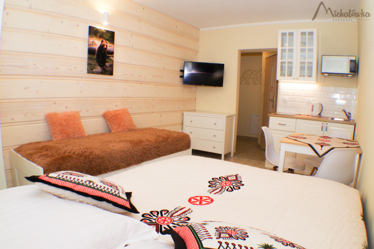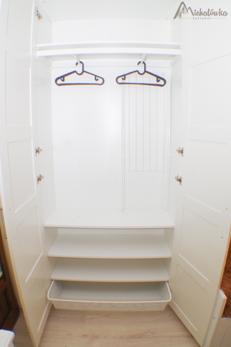 W pokoju jest oczywiście pozostałe wyposażenie widoczne na zdjęciach – stolik z krzesłami, szafa i komoda.