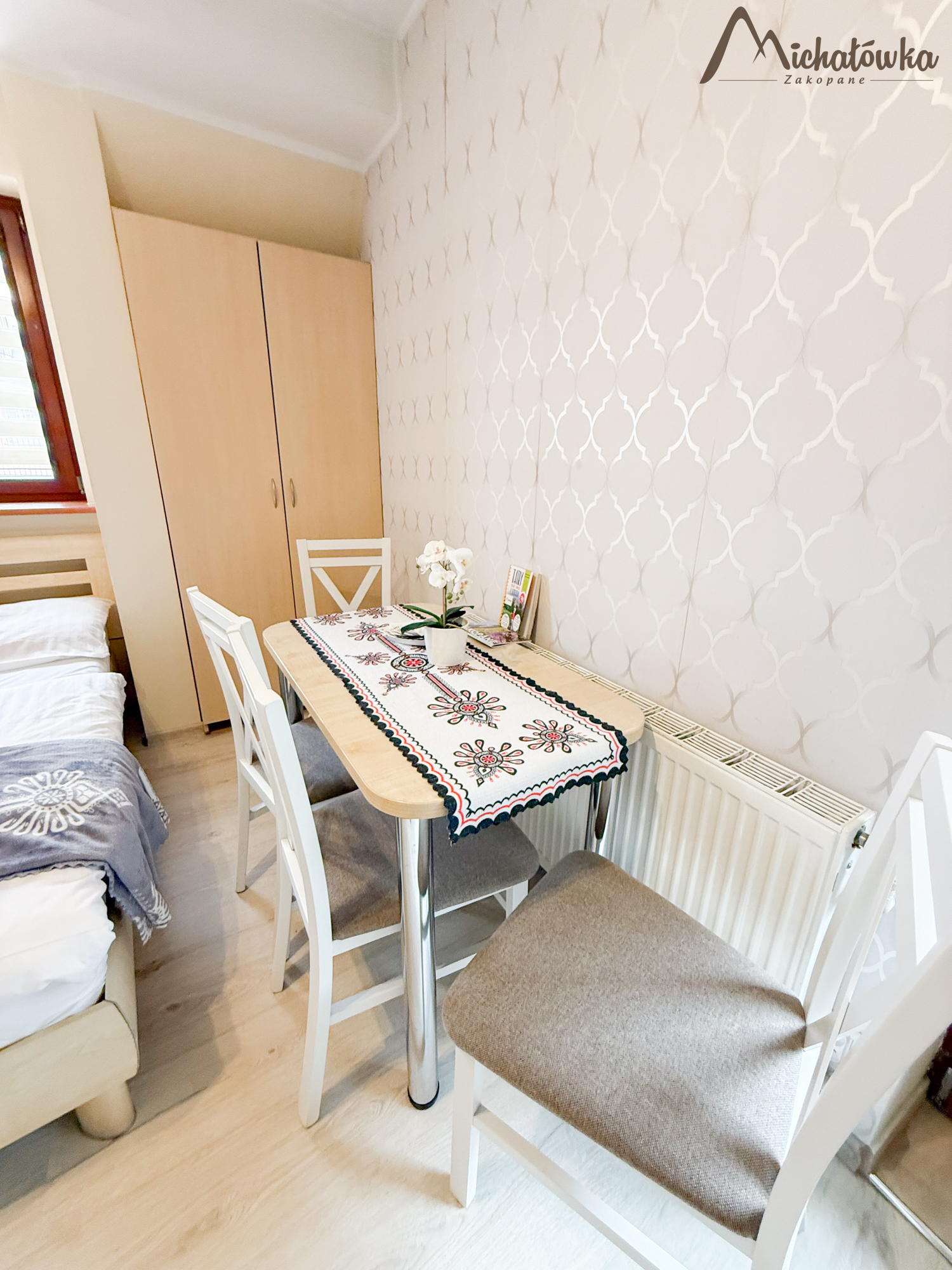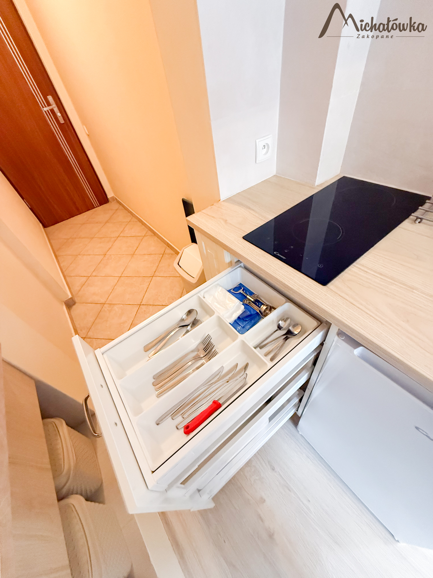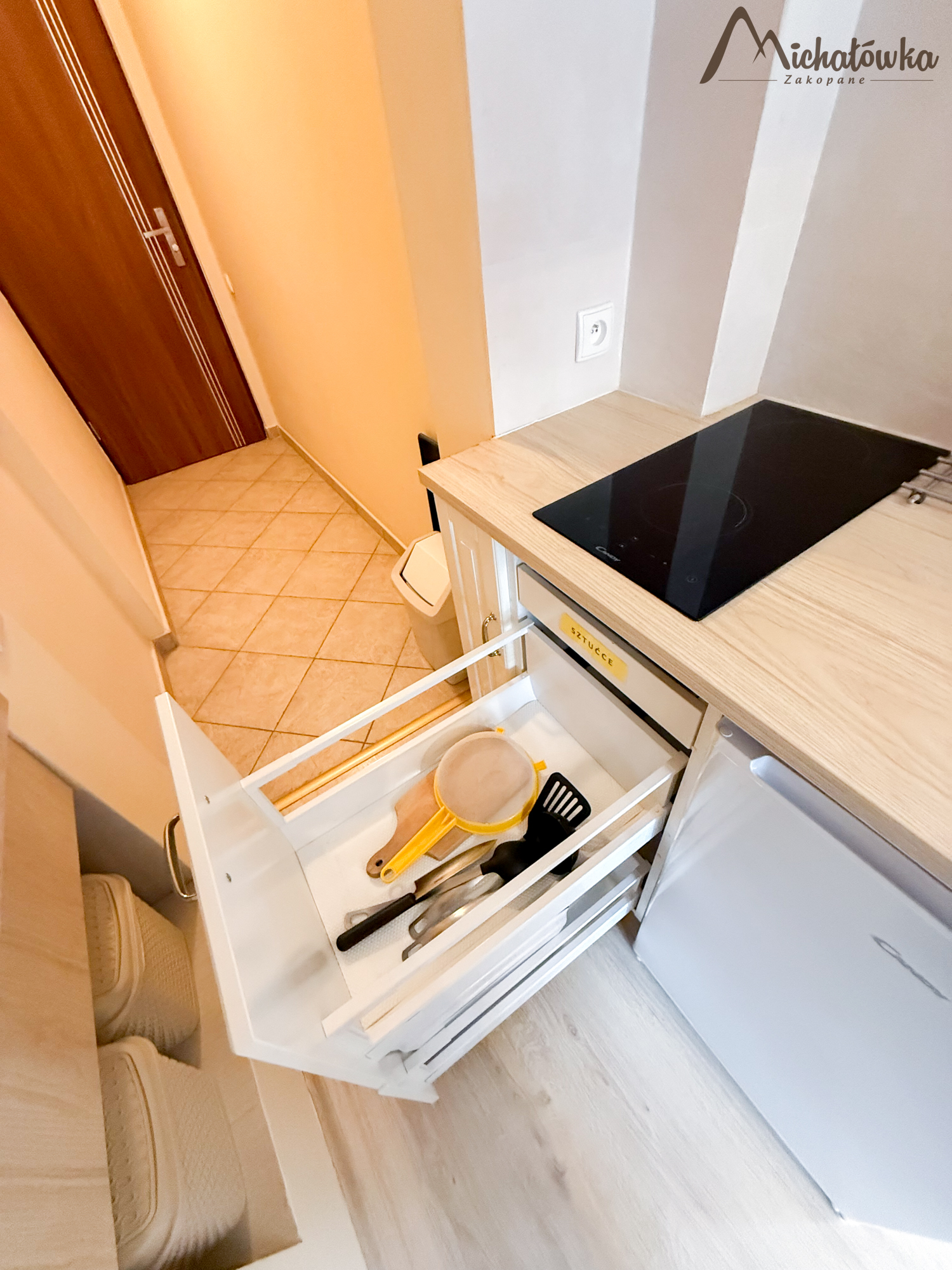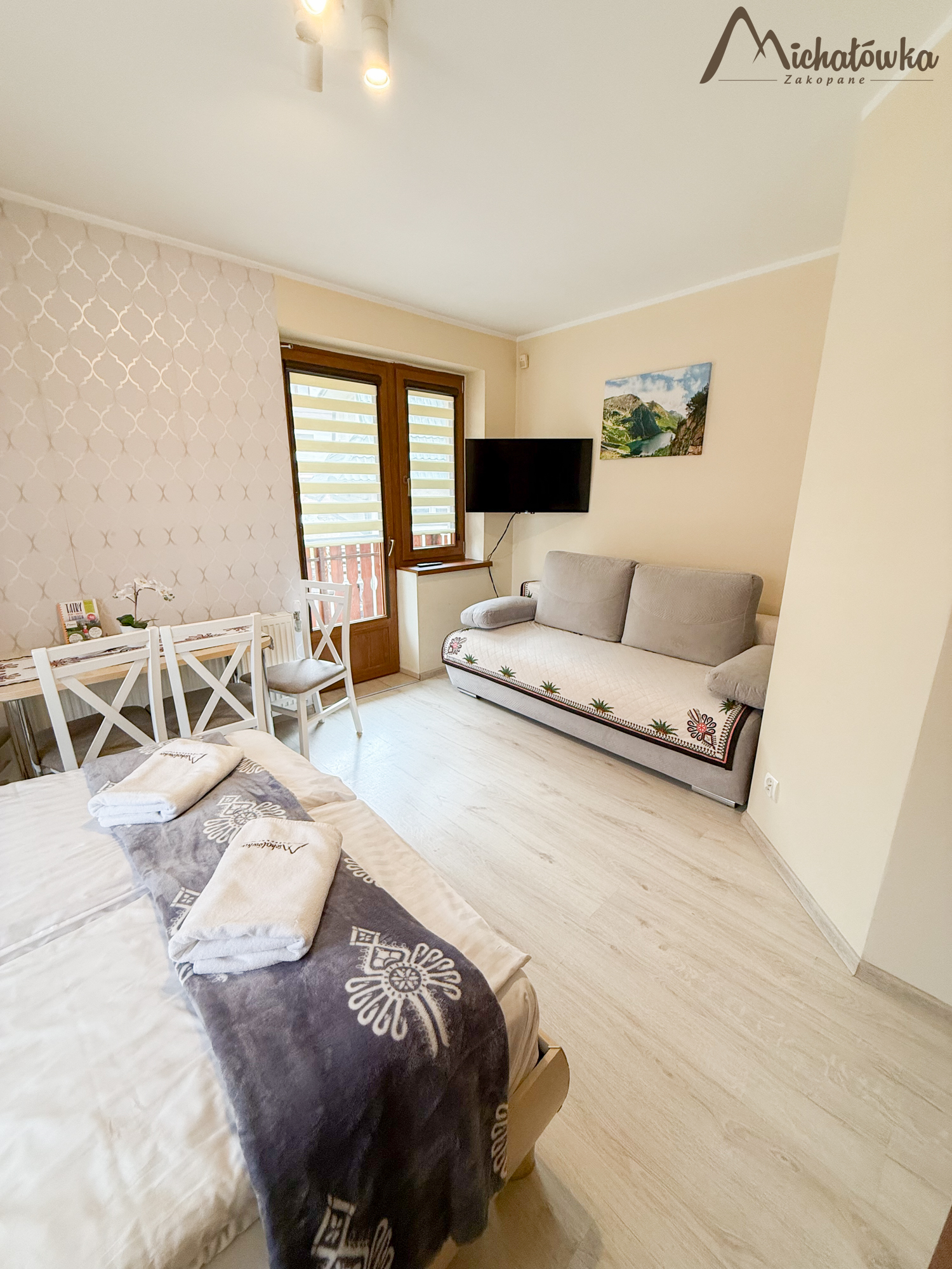 Pokój znajduje się na 2 piętrze. Łazienka jest z wanną (wejście bezpośrednio z pokoju). W pokoju znajduje się łóżko małżeńskie + rozkładane łóżko małżeńskie, TV LCD, aneks kuchenny: lodówka, czajnik, elektryczna płyta indukcyjna, kuchenka mikrofalowa, garnki, patelnia, sztućce, talerze, szklanki itp.
