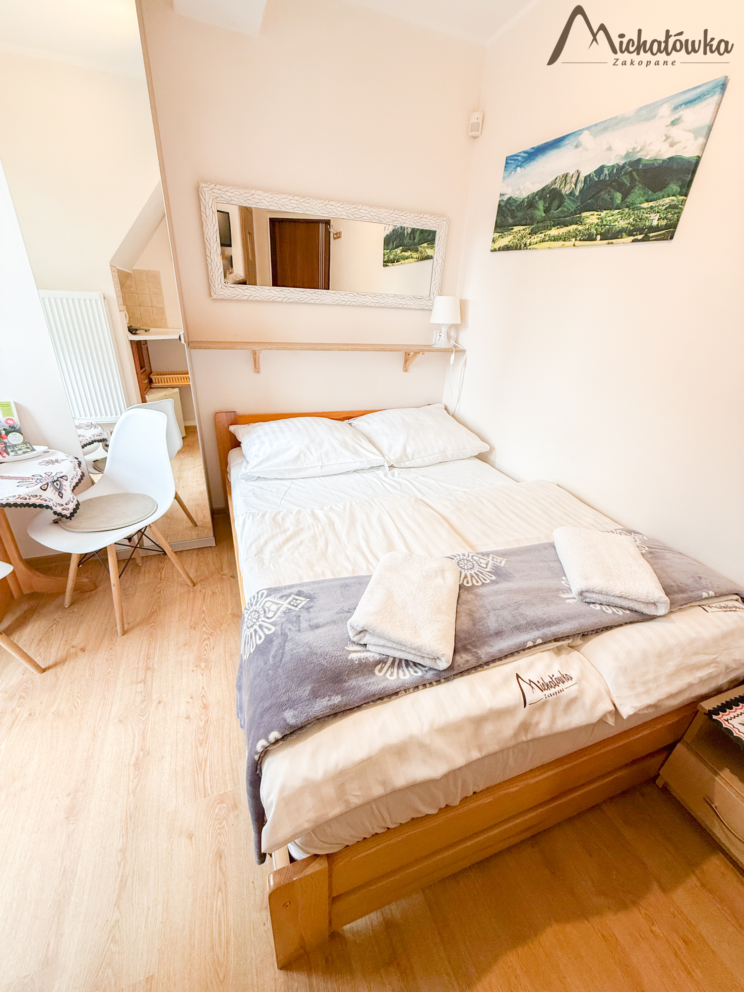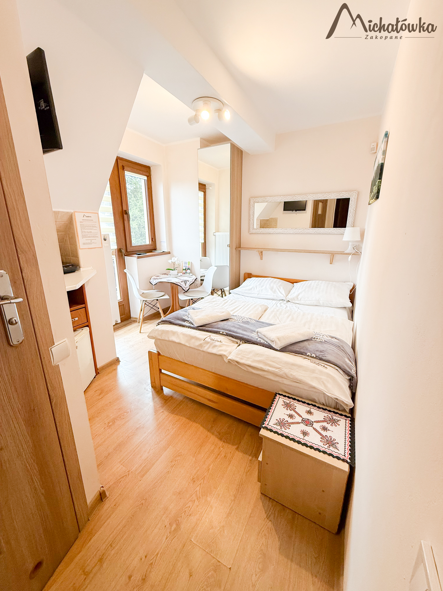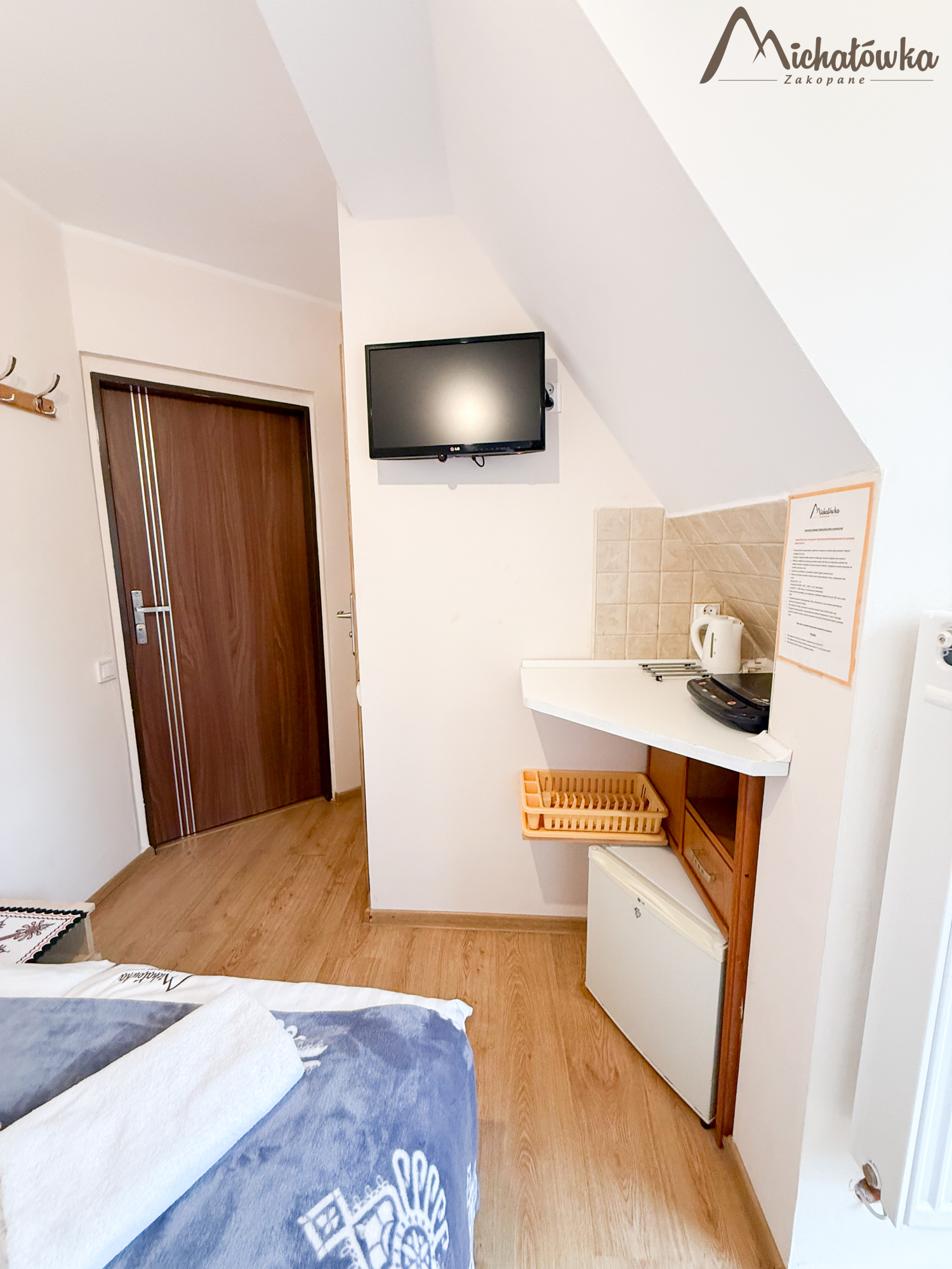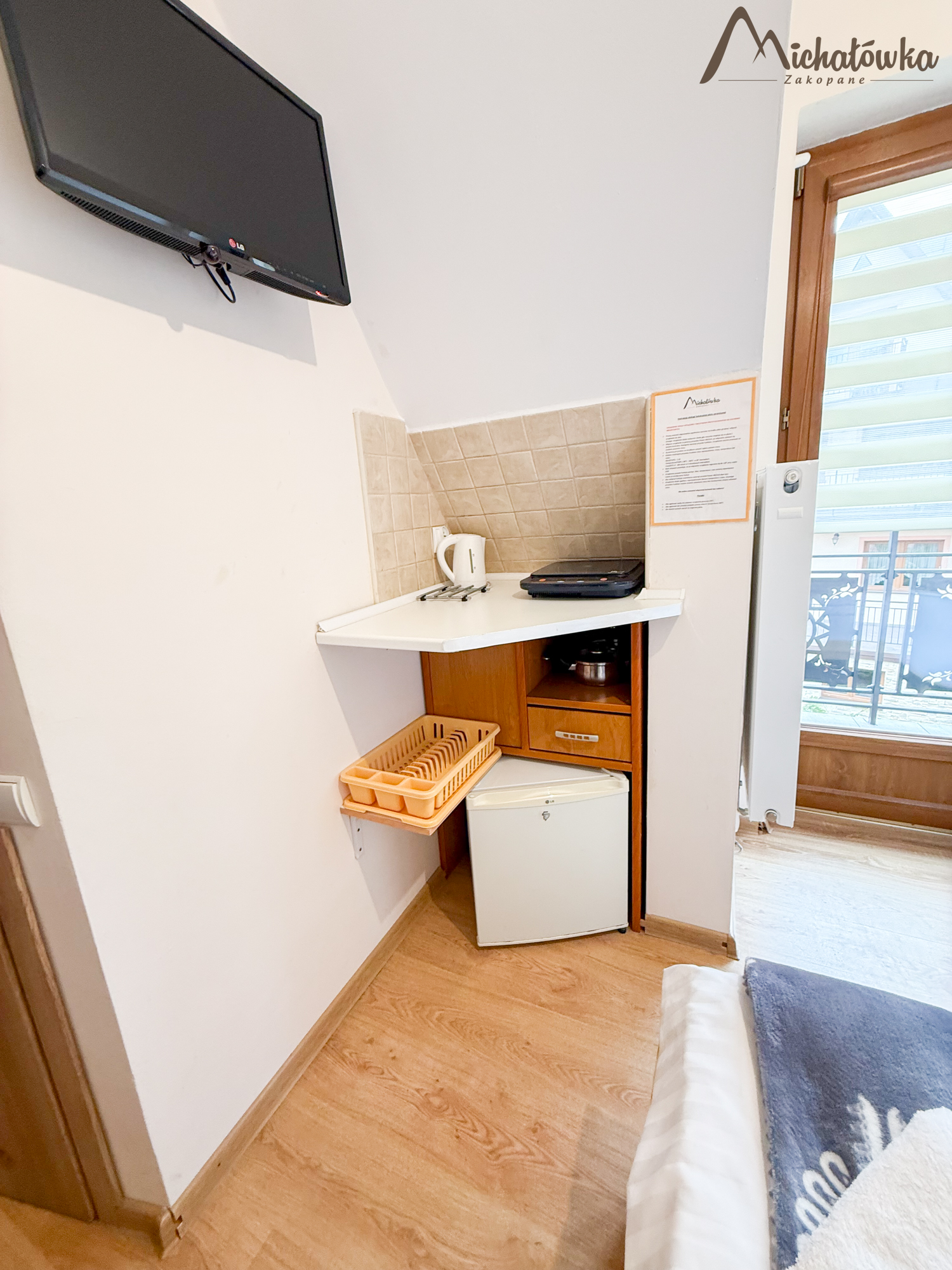 Pokój jest na 2 piętrze i znajduje się w nim łóżko małżeńskie, TV LED, mini aneks kuchenny: lodówka, czajnik; elektryczna płyta indukcyjna, garnki, patelnia, sztućce, talerze, szklanki itp. Łazienka jest z prysznicem (wejście bezpośrednio z pokoju).