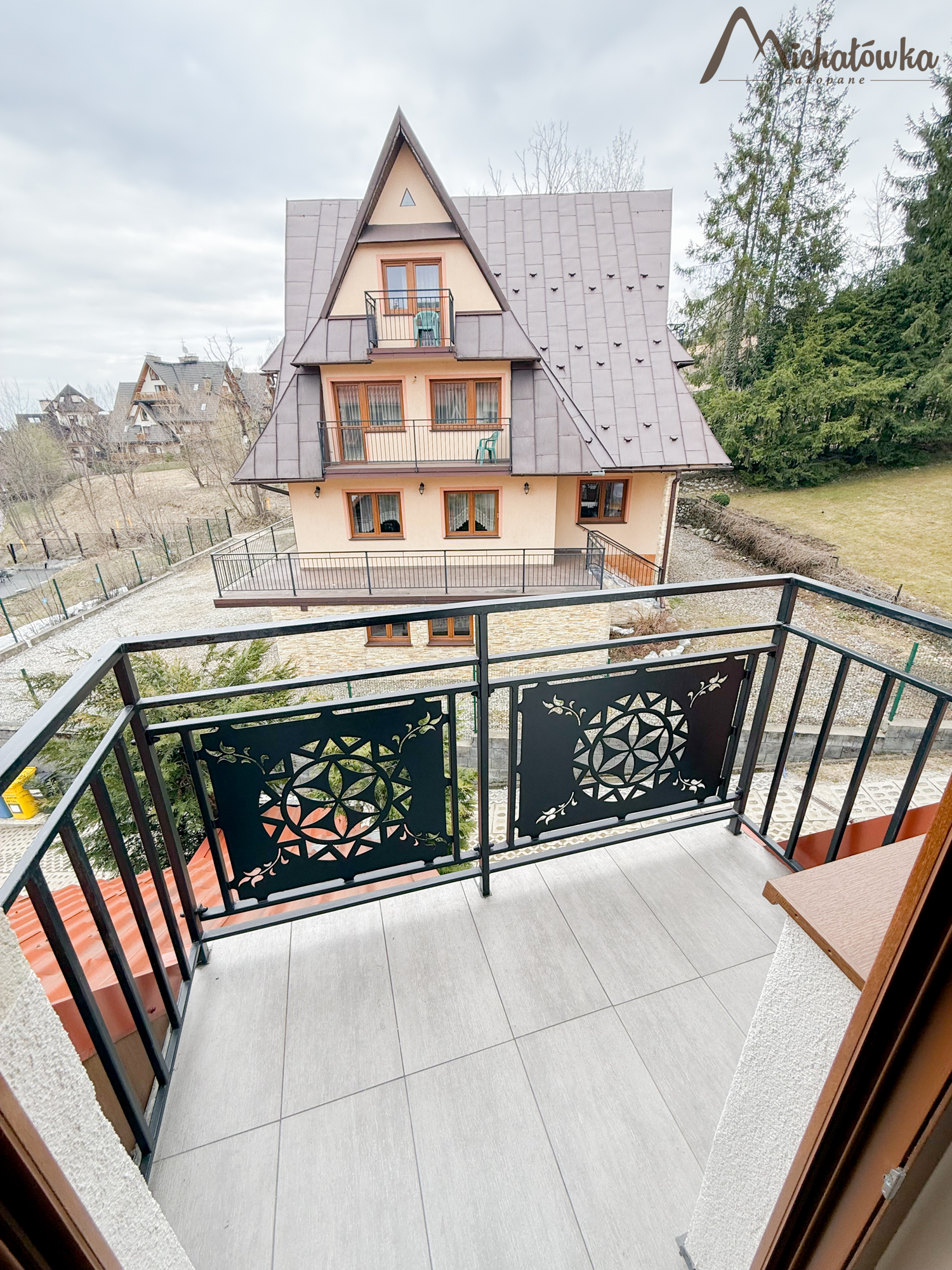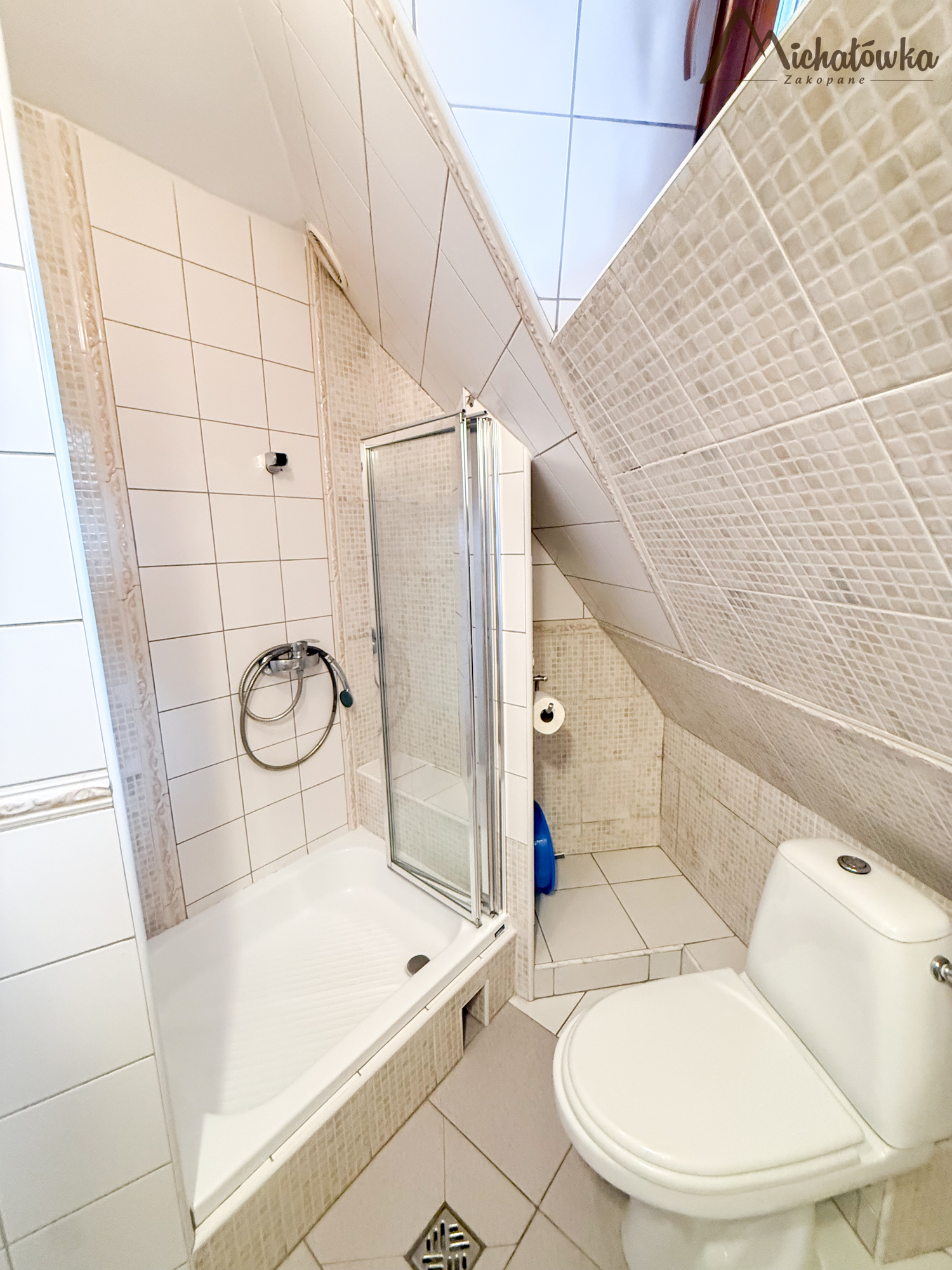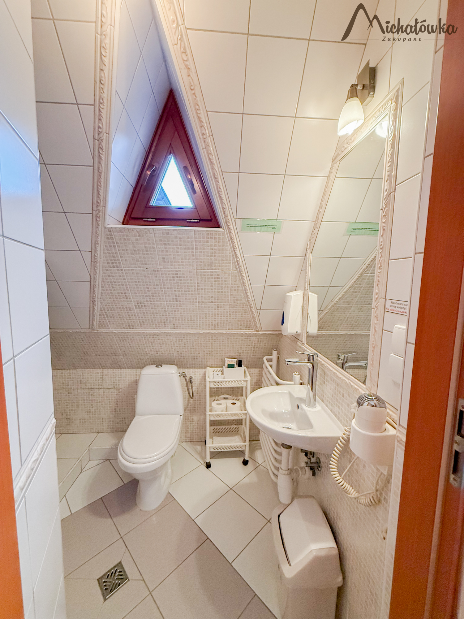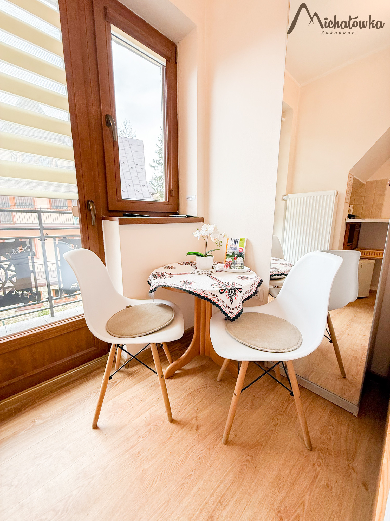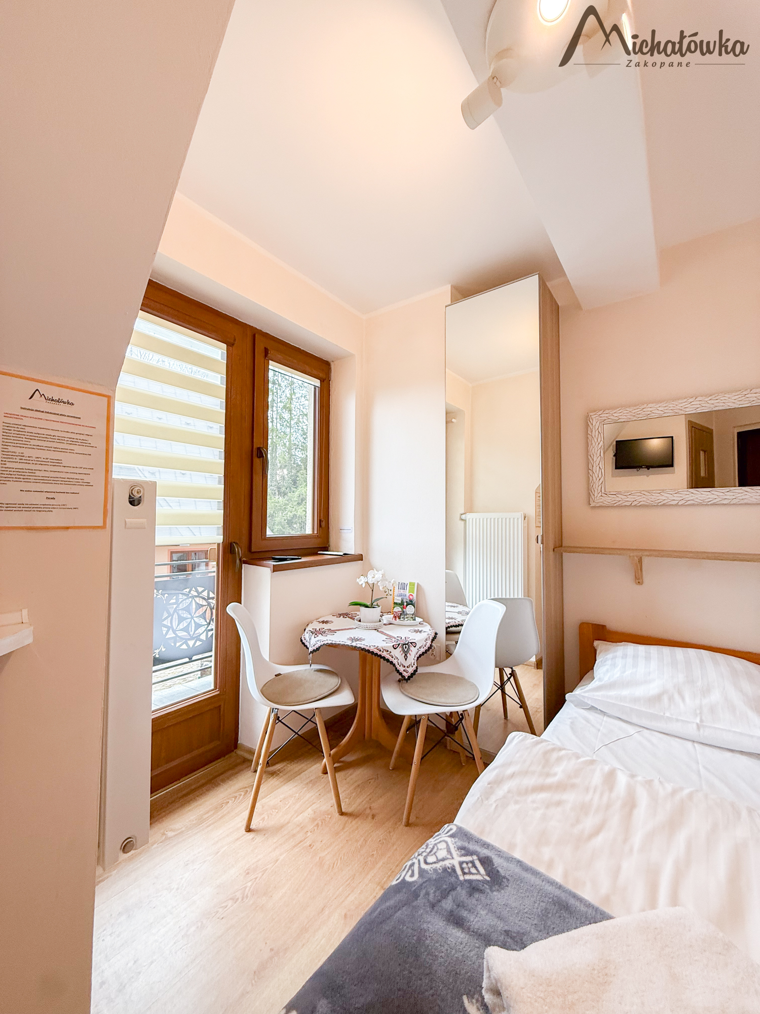Pokój jest na 2 piętrze i znajduje się w nim łóżko małżeńskie, TV LED, mini aneks kuchenny: lodówka, czajnik; elektryczna płyta indukcyjna, garnki, patelnia, sztućce, talerze, szklanki itp. Łazienka jest z prysznicem (wejście bezpośrednio z pokoju).